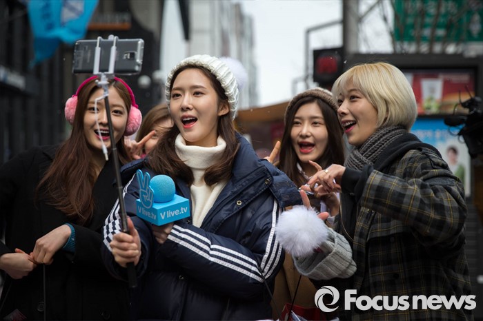 (서울=포커스뉴스) 3·1절을 하루 앞둔 29일 오전 아이돌걸그룹 '다이아'가 서울 강남역 앞에서 태극기 나눔행사를 하고 있다.