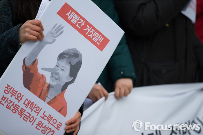 (서울=포커스뉴스) 29일 오후 서울 광화문광장에서 21세기 한국대학생연합 회원들이 정부의 반값등록금을 촉구하는 기자회견을 하고 있다.
