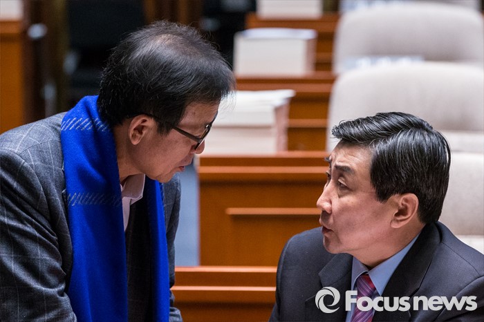 (서울=포커스뉴스) 이종걸(오른쪽) 더불어민주당 원내대표와 원혜영 더불어민주당 의원이 29일 오후 서울 영등포구 국회에서 열린 의원총회에 자리해 대화를 나누고 있다.