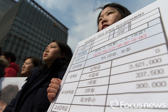 (서울=포커스뉴스) 29일 오후 서울 광화문광장에서 21세기 한국대학생연합 회원들이 정부의 반값등록금을 촉구하는 기자회견을 하고 있다.
