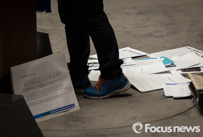 (서울=포커스뉴스) 테러방지법 직권상정에 반발해 야당이 무제한 토론(필리버스터)를 일주일째 진행하며 총 135시간을 돌파한 29일 오후, 서영교 더불어민주당 의원이 서울 여의도 국회 본회의장에서 토론을 하고 있는 가운데 서 의원 발 밑에 서 의원이 준비한 토론 자료들이 흩어져 있다.