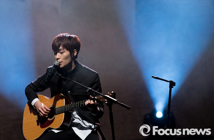 (서울=포커스뉴스) 29일 오후 서울 강남구 일지아트홀에서 신인 보이그룹 크나큰의 멤버 오희준이 데뷔 쇼케이스에서 열창을 하고 있다.