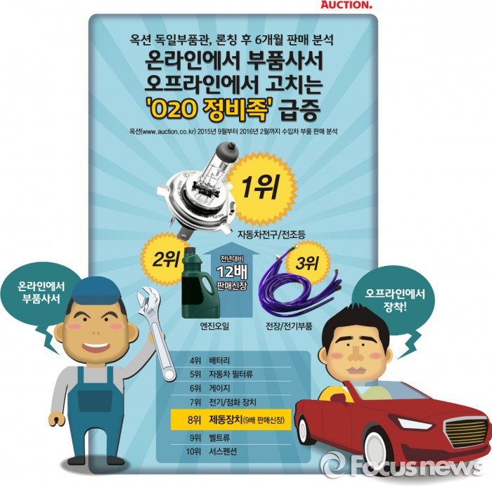 김순석 옥션 자동차레져팀장은 “수입차 부품을 온라인에서 직접 사는 경향으로 지난 해 옥션의 수입차 부품 판매는 전년 대비 111% 성장했을 정도”라며 “소비자들의 수요와 편의성 향상을 위해 이번 독일부품관의 부품검색환경을 개선해 새롭게 선보이고 여러 편의 서비스를 제공함으로써 보다 많은 이들에게 실질적인 도움이 되길 바란다”고 말했다.옥션은 독일 수입차 전문 부품관의 매출을 분석한 결과, 온라인에서 부품을 사서 오프라인에서 장착하는 O2O정비족이 급증한 것으로 나타났다고 29일 밝혔다.<사진제공=옥션>