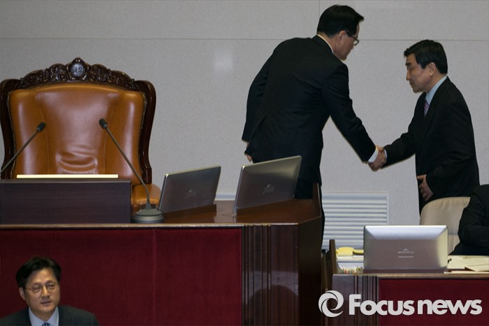 (서울=포커스뉴스) 테러방지법 직권상정에 반발해 야당이 무제한 토론(필리버스터)를 일주일째 진행하며 약 140시간을 돌파한 29일 오후 서울 여의도 국회 본회의장에서 정의화(왼쪽) 국회의장과 이종걸 더불어민주당 원내대표가 만나 대화하고 있다.