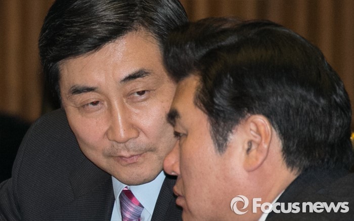 (서울=포커스뉴스) 테러방지법 직권상정에 반발해 야당이 무제한 토론(필리버스터)를 일주일째 진행하며 약 140시간을 돌파한 29일 오후 서울 여의도 국회 본회의장에서 원유철(오른쪽) 새누리당 원내대표와 이종걸 더불어민주당 원내대표가 대화하고 있다.