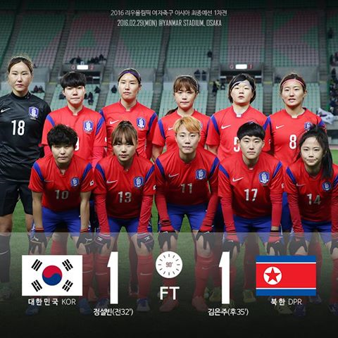한국 여자축구대표팀은 29일 일본 오사카 얀마스타디움에서 열린 북한 여자대표팀과의 2016 리우올림픽 여자축구 아시아 최종예선 1차전에서 정설민이 전반전에 선제골을 기록했다. 하지만 후반 북한 김은주에게 동점골을 내주며 아쉬운 무승부를 기록했다.