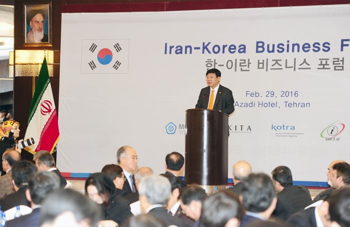 (서울=포커스뉴스) 주형환 산업통상자원부 장관이 29일(현지시간) 이란 테헤란 아자디호텔 자린홀에서 열린 한-이란 경제협력 비즈니스 포럼에 참석해 축사를 하고 있다. <사진제공=산업통상자원부>