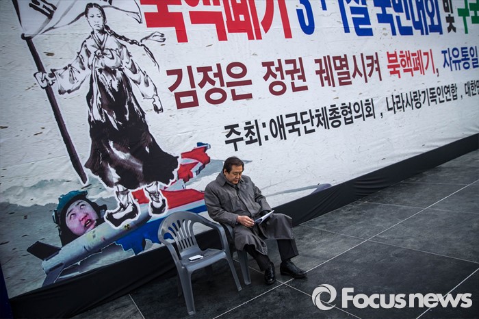 (서울=포커스뉴스) 김무성 새누리당 대표가 1일 오후 서울시청 앞 광장에서 열린 '북핵폐기 삼일절 국민대회 및 구국기도회'에 참석, 발언 차례를 기다리며 단상에 올라 자료를 살피고 있다.