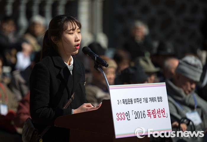 | △ 333인 '2016 독립선언' 행사에서 발언하는 대학생 |