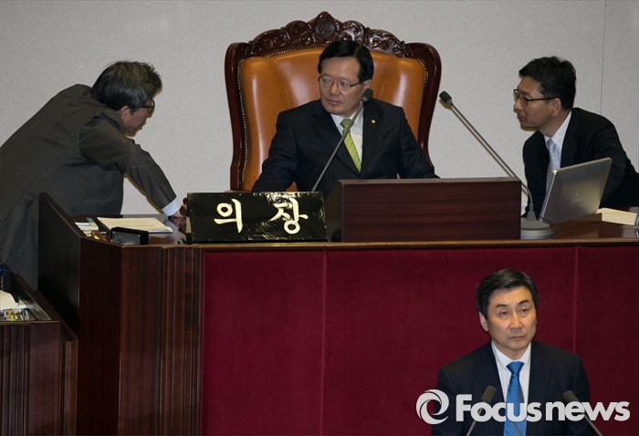 (서울=포커스뉴스) 테러방지법 직권상정에 반발해 야당이 세계 최장 기록의 필리버스터(무제한 토론)를 이어가고 있는 2일 오전 서울 여의도 국회 본회의장에서 토론에 참여한 이종걸(앞) 더불어민주당 원내대표의 발언 중에 정의화(뒤 가운데) 국회의장과 박형준(뒤 왼쪽) 국회 사무총장 등 관계자들이 대화하고 있다. 야당은 이날 필리버스터를 중단하고 선거법 등을 처리할 예정이다.