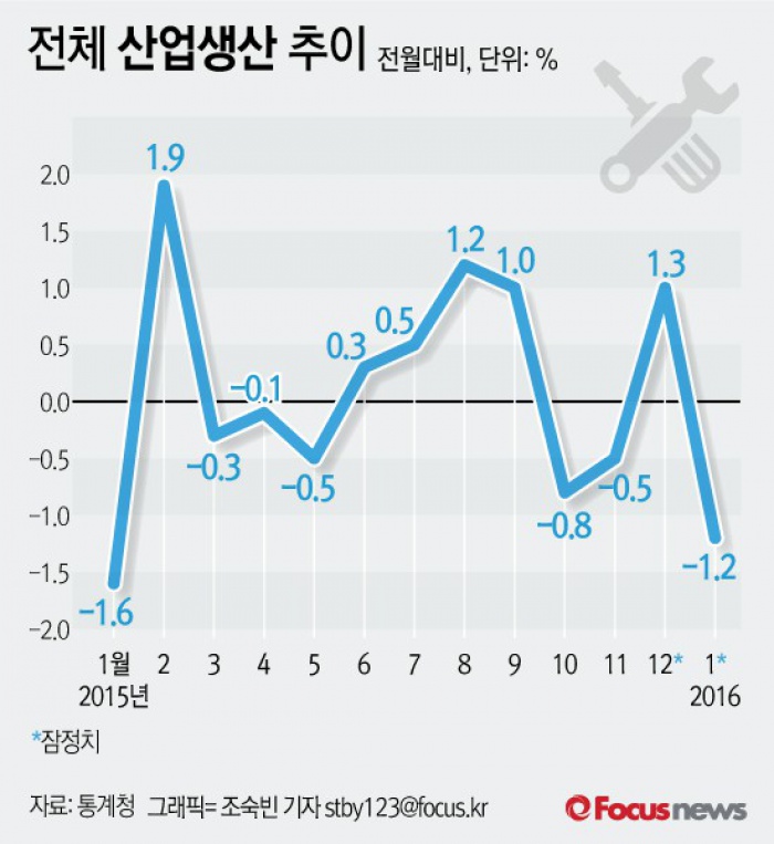 (서울=포커스뉴스) 통계청이 2일 발표한 '산업활동동향'을 보면 1월 전체 산업생산은 지난해 12월보다 1.2% 감소했다.