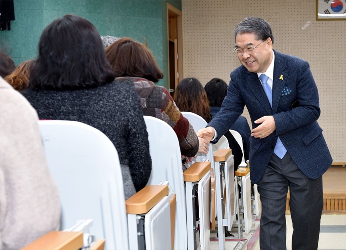 (서울=포커스뉴스) 교육 현장방문을 한 이재정 경기도교육감이 2일 오전 경기도 안산시 단원고등학교에서 교무회의를 마친 뒤 교직원들고 인사를 하고 있다. <사진제공=경기도교육청>