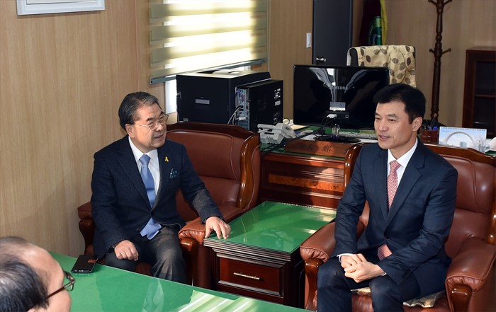 (서울=포커스뉴스) 이재정(왼쪽) 경기도교육감이 2일 오전 경기도 안산 단원고등학교에 마련된 교장실(컨테이너)에서 정광윤 신임교장과 대화를 나누고 있다. <사진제공=경기도교육청>
