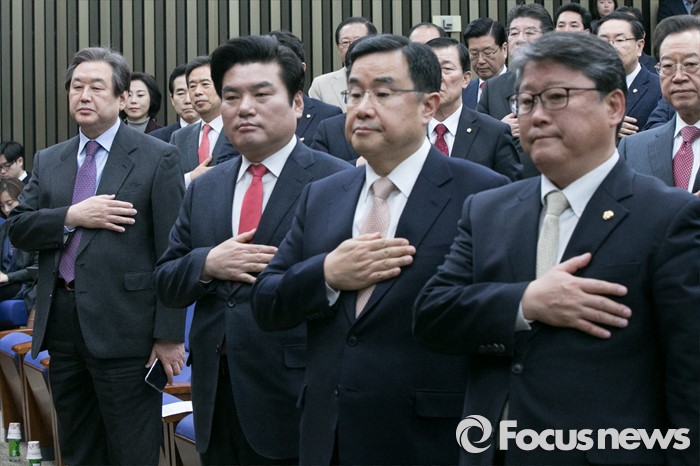 (서울=포커스뉴스) 김무성(왼쪽) 새누리당 대표를 비롯한 지도부가 2일 오전 서울 여의도 국회에서 열린 의원총회에 참석해 국민의례를 하고 있다. 왼쪽부터 김 대표, 원유철 원내대표, 김정훈 정책위의장, 조원진 원내수석부대표.