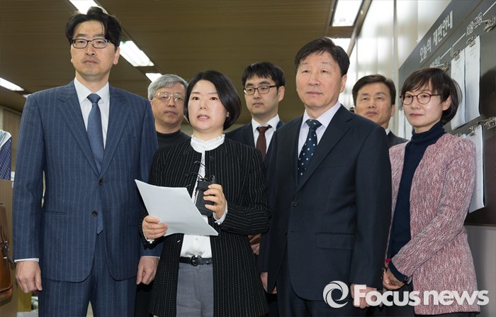 (서울=포커스뉴스) 2일 오전 서울 서초구 중앙지방법원 기자실에서 위은진(앞줄 왼쪽 두번째) 대한변호사협회 인권위원회 부위원장이 테러방지법안 의견서 사태에 관한 입장을 발표하고 있다.