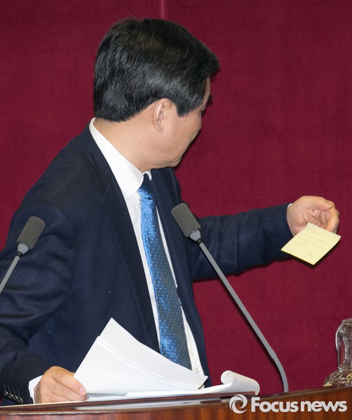 (서울=포커스뉴스) 테러방지법 직권상정에 반발해 야당이 세계 최장 기록의 필리버스터(무제한 토론)를 이어가고 있는 2일 오전 서울 여의도 국회 본회의장에서 토론에 참여한 이종걸 더불어민주당 원내대표가 발언 중 국회 관계자로부터 전달받은 메모를 보고 있다. 야당은 이날 필리버스터를 중단하고 선거법 등을 처리할 예정이다.