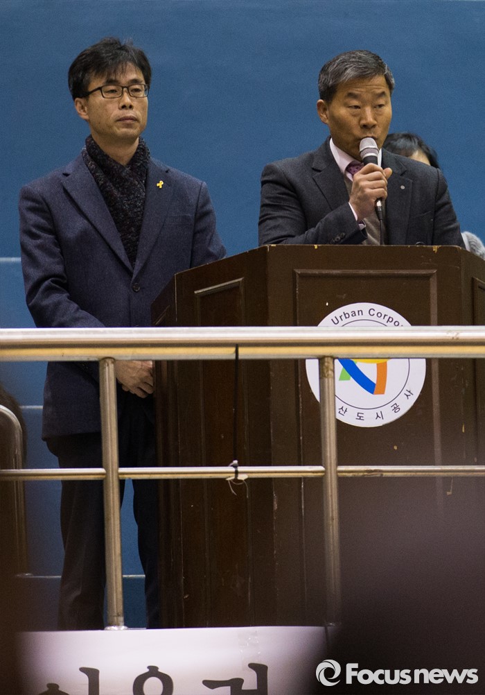 (안산=포커스뉴스) 2일 오전 경기도 안산시 단원구 올림픽기념관에서 열린 단원고등학교 입학식에 참석한 장기(오른쪽) 단원고 학부모협의회 학교운영위원장과 전명선 4·16 가족협의회 위원장이 공동 발표문을 낭독하고 있다.