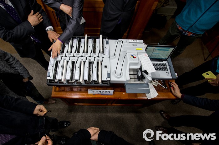 (과천=포커스뉴스) 2일 오전 경기도 과천시 중앙선거관리위원회에서 열린 '투표지분류기 및 선상투표 쉴드팩스 시연'에서 중앙선관위 직원이 투표지분류기 시연을 하고 있다.