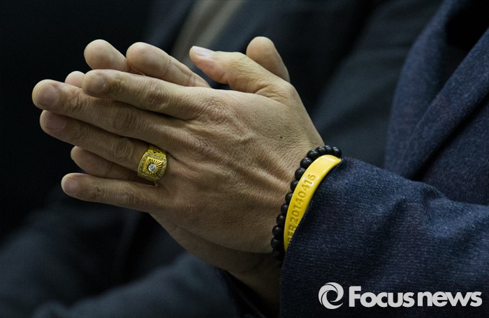 (안산=포커스뉴스) 2일 오전 경기도 안산시 단원구 올림픽기념관에서 열린 단원고등학교 입학식에 참석한 전명선 4·16 가족협의회 위원장이 세월호 추모 팔찌를 하고 있다.