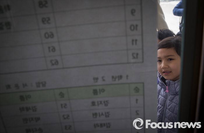 (서울=포커스뉴스) 2일 오전 서울 이태원 초등학교에서 열린 2016학년도 입학식에 참석한 신입생이 학급을 확인하고 있다.