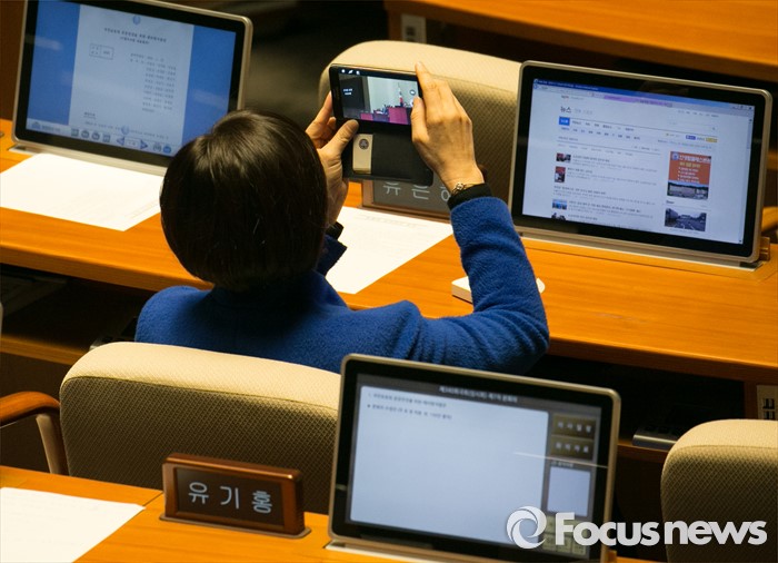 (서울=포커스뉴스) 테러방지법 직권상정에 반발해 야당이 세계 최장 기록의 필리버스터(무제한 토론)를 이어가고 있는 2일 오후 서울 여의도 국회 본회의장에서 유은혜 더불어민주당 의원이 토론에 참여한 이종걸 더불어민주당 원내대표의 모습을 촬영하고 있다. 야당은 이날 필리버스터를 중단하고 선거법 등을 처리할 예정이다.