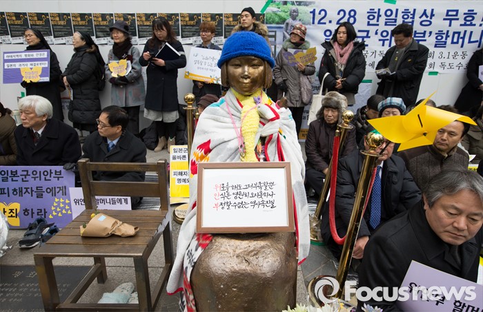 (서울=포커스뉴스) 2일 오후 서울 종로구 옛 주한일본대사관 앞에서 한국정신대문제대책협의회, 학생들을 비롯한 참석자들이 '제1220차 일본군 위안부 문제해결을 위한 정기 수요시위'를 하고 있다.