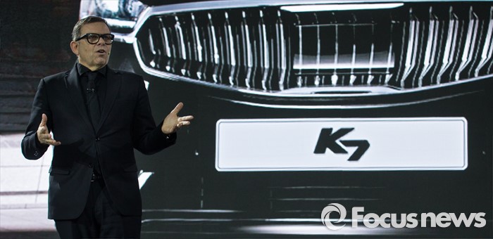 해외에서도 스포티지(구형 스포티지R 포함)를 비롯한 K5(구형 K5 포함), K3(중국 포르테 포함), 쏘렌토 등 주력 차종과 프라이드(중국 K2 포함), 씨드 등 현지 전략형 차종들이 해외판매 실적을 견인했다.(서울=포커스뉴스) 서울 강남구 그랜드 인터컨티넨탈 서울 파르타스에서 열린 '기아차 올 뉴 K7 신차발표회'에서 피터 슈라이어 현대기아차 디자인 총괄 사장이 발표를 하고 있다. 오장환 기자