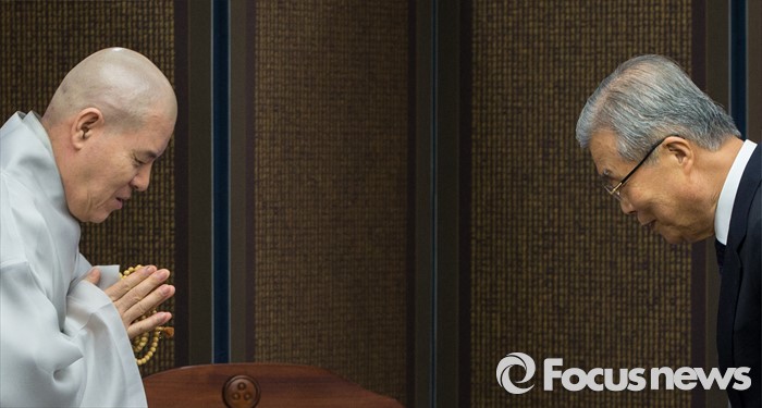 (서울=포커스뉴스) 2일 오후 서울 종로구 조계사를 찾은 김종인(오른쪽) 더불어민주당 비상대책위원회 대표가 조계종 총무원장 자승 스님을 만나 인사하고 있다.