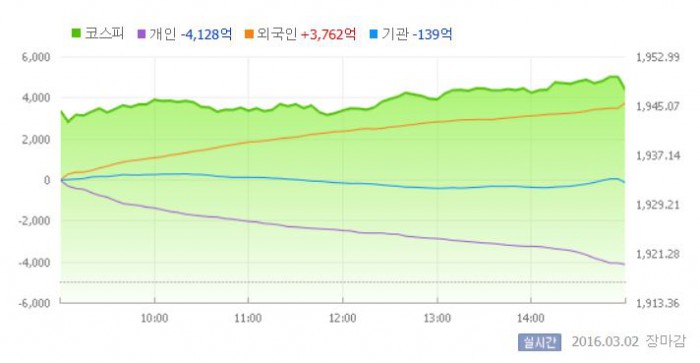 2일 코스피지수는 전거래일 대비 1.60%(30.76포인트) 상승한 1947.42에 장을 마쳤다. 코스피가 종가 기준으로 1940선에 오른 것은 올 들어 처음이다.