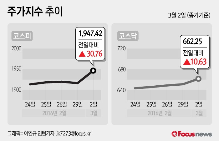 (서울=포커스뉴스) 2일 코스피지수는 전날 보다 1.60%(30.76포인트) 오른 1947.42에 장을 마쳤다. 코스닥지수는 전일 대비 1.63%(10.63포인트) 오른 662.25에 마감했다.