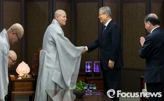 (서울=포커스뉴스) 2일 오후 서울 종로구 조계사를 찾은 김종인(왼쪽 네 번째) 더불어민주당 비상대책위원회 대표가 조계종 총무원장 자승 스님을 만나 악수하고 있다.