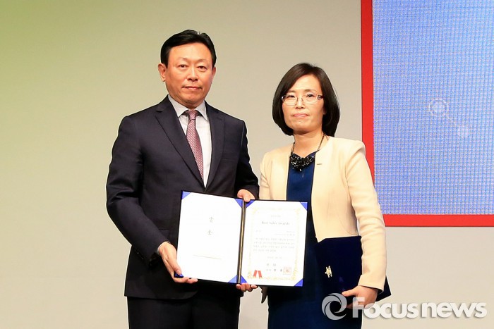 수상자들에게는 상패와 상금, 여행상품권 등이 주어졌다. 신동빈 회장 외에도 정책본부 임원 과 각 계열사 대표들이 시상식에 참석해 수상자들을 격려했다.신동빈 롯데그룹 회장(왼쪽)이 2015 베스트 세일즈 어워즈 시상식에서 대상을 수상한 윤혜란 롯데카드 서면지점장에게 상장을 수여한 후 기념촬영을 하고 있다.<사진제공=롯데>