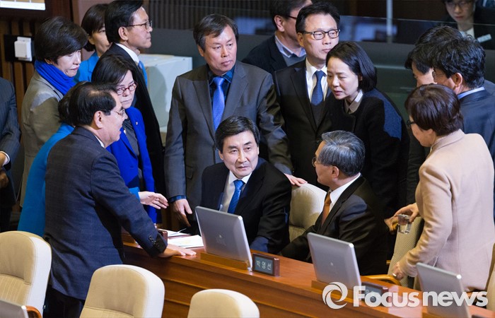 (서울=포커스뉴스) 테러방지법 직권상정에 반발해 야당이 세계 최장 기록의 필리버스터(무제한 토론)를 이어가고 있는 2일 오후 서울 여의도 국회 본회의장에서 토론에 참여한 이종걸 더불어민주당 원내대표가 12시간 31분 발언을 끝으로 단상에서 내려와 동료의원들의 격려를 받고 있다.