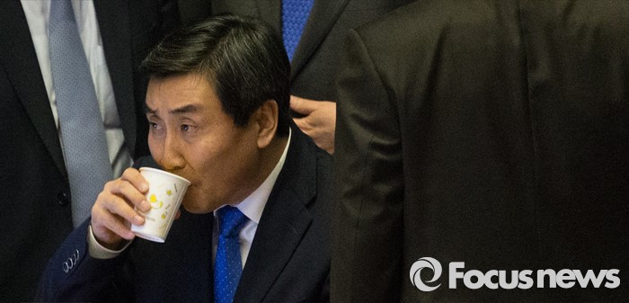 (서울=포커스뉴스) 테러방지법 직권상정에 반발해 야당이 세계 최장 기록의 필리버스터(무제한 토론)를 진행한 2일 오후 서울 여의도 국회 본회의장에서 마지막 주자인 이종걸 더불어민주당 원내대표가 토론을 마친 뒤 동료 의원들의 격려를 받으며 물을 마시고 있다. 마지막 주자로 나선 이 원내대표는 이날 정청래 의원의 기록인 11시간 40분을 경신한 12시간 31분을 기록하며 토론을 마쳤으며, 야당의 필리버스터는 약 193시간만에 종료됐다.