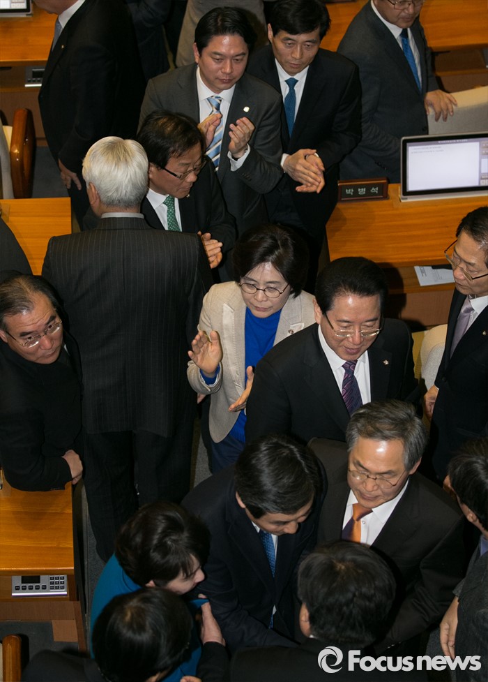 (서울=포커스뉴스) 테러방지법 직권상정에 반발해 야당이 세계 최장 기록의 필리버스터(무제한 토론)를 진행한 2일 오후 서울 여의도 국회 본회의장에서 마지막 주자인 이종걸 더불어민주당 원내대표가 토론을 마친 뒤 동료 의원들의 격려를 받으며 퇴장하고 있다. 마지막 주자로 나선 이 원내대표는 이날 정청래 의원의 기록인 11시간 40분을 경신한 12시간 31분을 기록하며 토론을 마쳤으며, 야당의 필리버스터는 약 193시간만에 종료됐다.