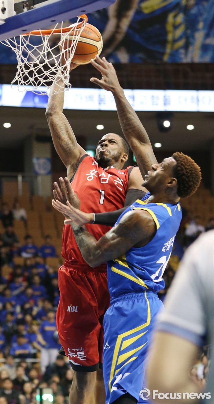 (서울=포커스뉴스) 2일 서울 잠실실내체육관에서 열린 2015-2016 프로농구 삼성-KGC 6강플레이오프 4차전에서 KGC 찰스 로드가 삼성 라틀리프를 제치며 원핸드 덩크를 시도하고 있다.