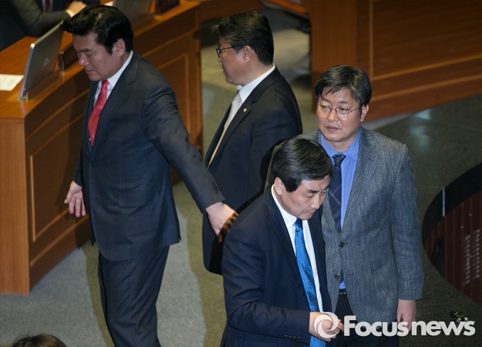 (서울=포커스뉴스) 2일 오후 서울 여의도 국회에서 열린 340회 국회(임시회) 7차 본회의에 참석한 이종걸(왼쪽 세번째) 더불어민주당 원내대표, 이춘석(왼쪽 네번째) 원내수석부대표가 정의화 국회의장의 모두발언에 항의하자 원유철(왼쪽 첫번째) 새누리당 원내대표, 조원진(왼쪽 두번째) 원내수석부대표가 말리며 대화한 뒤 각각 자리로 향하고 있다.