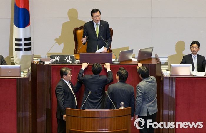 (서울=포커스뉴스) 2일 오후 서울 여의도 국회에서 열린 340회 국회(임시회) 7차 본회의에 참석한 이종걸 더불어민주당 원내대표, 이춘석 원내수석부대표가 정의화 국회의장의 모두발언에 항의하자 원유철 새누리당 원내대표, 조원진 원내수석부대표가 말리고 있다.