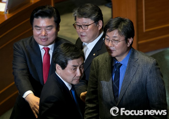 (서울=포커스뉴스) 2일 오후 서울 여의도 국회에서 열린 340회 국회(임시회) 7차 본회의에 참석한 이종걸(왼쪽 두번째) 더불어민주당 원내대표, 이춘석(오른쪽 첫번째) 원내수석부대표가 정의화 국회의장의 모두발언에 항의하자 원유철(왼쪽 첫번째) 새누리당 원내대표, 조원진(오른쪽 두번째) 원내수석부대표가 말리며 대화하고 있다.