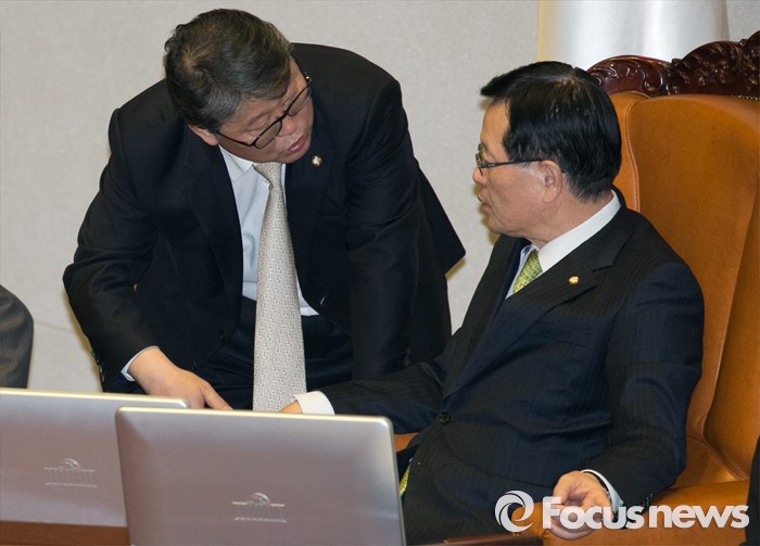(서울=포커스뉴스) 2일 오후 서울 여의도 국회에서 열린 340회 국회(임시회) 7차 본회의에 참석한 정의화(오른쪽) 국회의장과 조원진 새누리당 원내수석부대표가 대화하고 있다.