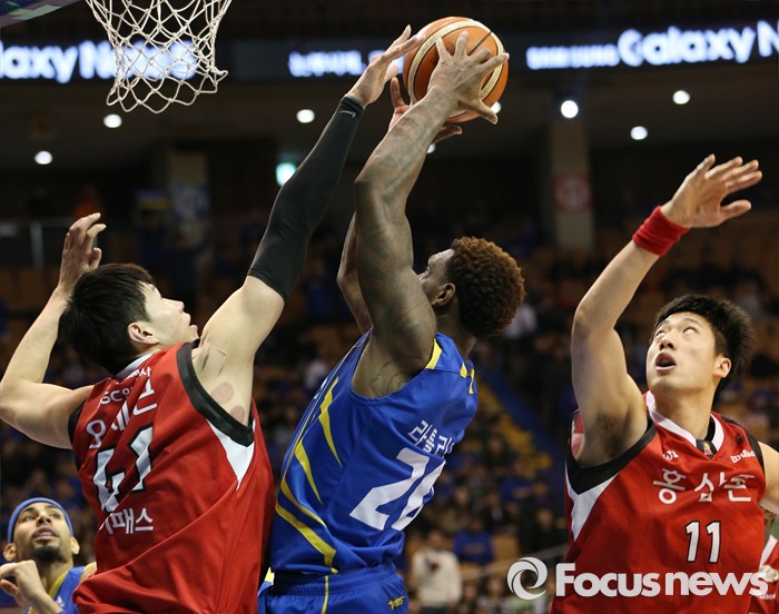 (서울=포커스뉴스) 2일 서울 잠실실내체육관에서 열린 2015-2016 프로농구 삼성-KGC 6강플레이오프 4차전에서 KGC 오세근이 삼성 라틀리프의 골밑슛에 블록을 시도하고 있다.