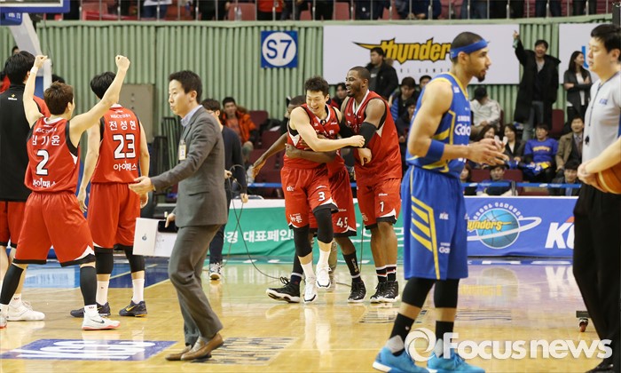 (서울=포커스뉴스) 2일 서울 잠실실내체육관에서 열린 2015-2016 프로농구 삼성-KGC 6강플레이오프 4차전에서 삼성을 물리치고 4강플레이오프에 진출한 KGC 선수들이 기뻐하고 있다.