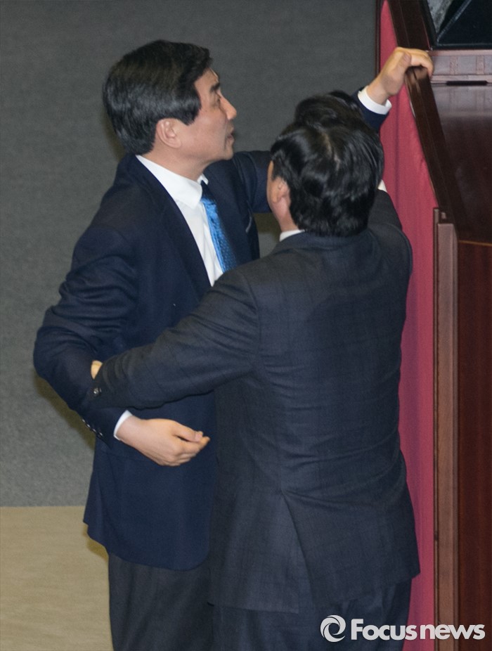 (서울=포커스뉴스) 2일 오후 서울 여의도 국회에서 열린 340회 국회(임시회) 7차 본회의에 참석한 이종걸(왼쪽) 더불어민주당 원내대표가 정의화 국회의장의 모두발언에 항의하자 원유철 새누리당 원내대표가 말리고 있다.