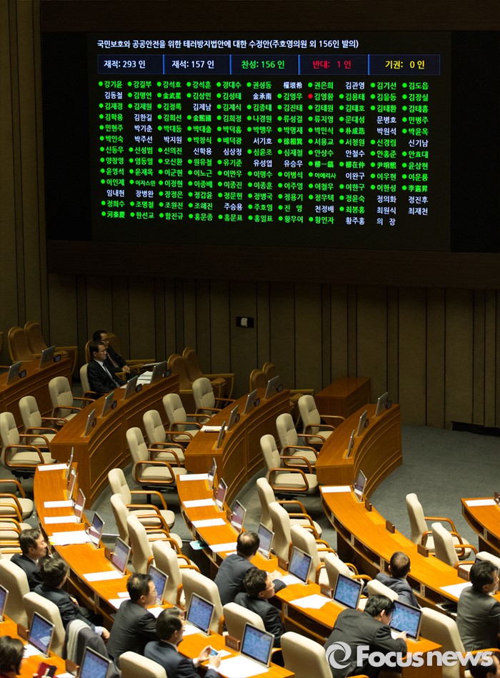 (서울=포커스뉴스) 2일 오후 서울 여의도 국회에서 열린 340회 국회(임시회) 7차 본회의에서 국민보호와 공공안전을 위한 테러방지법안에 대한 수정안(주호영 의원 외 156인 발의)가 재석 157인 중 찬성 156인, 반대 1인으로 통과되고 있다. 야당은 이날 여당의 수정안에 반발해 표결에 참여하지 않은 채 퇴장했다.