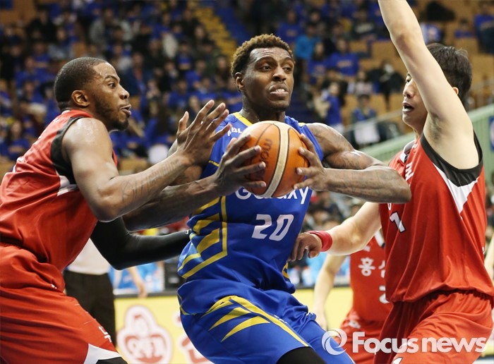 (서울=포커스뉴스) 2일 서울 잠실실내체육관에서 열린 2015-2016 프로농구 삼성-KGC 6강플레이오프 4차전에서 삼성 라틀리프의 골밑 공격에 KGC 찰스 로드와 양희종이 앞 뒤에서 마크하고 있다.