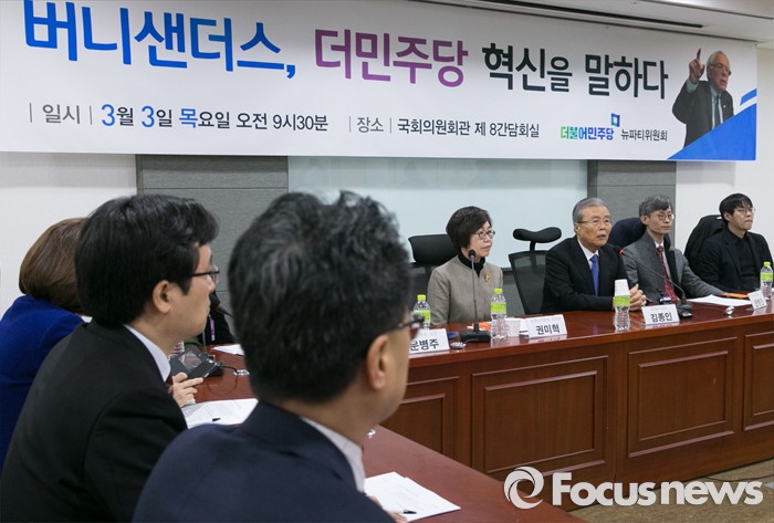(서울=포커스뉴스) 3일 오전 서울 여의도 국회 의원회관에서 더불어민주당 뉴파티위원회 주최로 열린 '버니 샌더스 더민주 혁신을 말하다' 토론회에 참석한 김종인 비대위 대표가 인사말을 하고 있다.