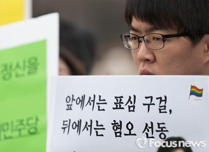 (서울=포커스뉴스) 3일 오전 서울 여의도 국회 앞에서 성소수자차별반대 무지개행동을 비롯한 인권시민사회단체가 성소수자 혐오, 차별에 동조하는 새누리당 김무성 대표와 더불어민주당 박영선 비대위원을 규탄하는 기자회견을 하고 있다.
