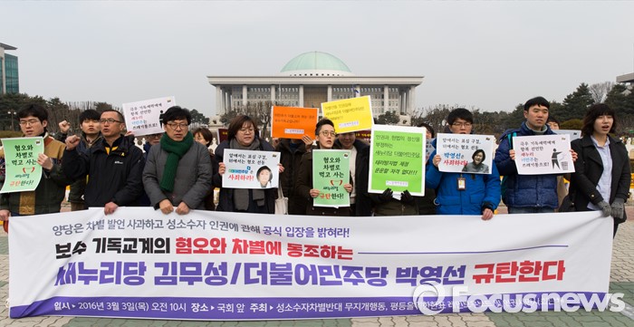 (서울=포커스뉴스) 3일 오전 서울 여의도 국회 앞에서 성소수자차별반대 무지개행동을 비롯한 인권시민사회단체가 성소수자 혐오, 차별에 동조하는 새누리당 김무성 대표와 더불어민주당 박영선 비대위원을 규탄하는 구호를 외치고 있다.