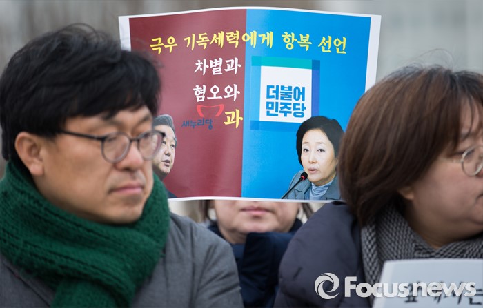(서울=포커스뉴스) 3일 오전 서울 여의도 국회 앞에서 성소수자차별반대 무지개행동을 비롯한 인권시민사회단체가 성소수자 혐오, 차별에 동조하는 새누리당 김무성 대표와 더불어민주당 박영선 비대위원을 규탄하는 기자회견을 하고 있다.