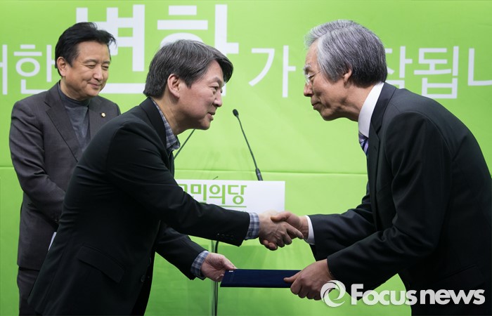 (서울=포커스뉴스) 안철수 국민의당 상임공동대표가 3일 오전 서울 마포구 국민의당 당사에서 장순식 박사, 원자력안전특위 위원장 위촉을 발표한 후 인사를 나누고 있다.